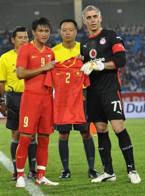 Công Vinh tặng áo lưu niệm cho thủ môn Antonios Nikopolidis - người từng cùng tuyển Hy Lạp vô địch Euro 2004