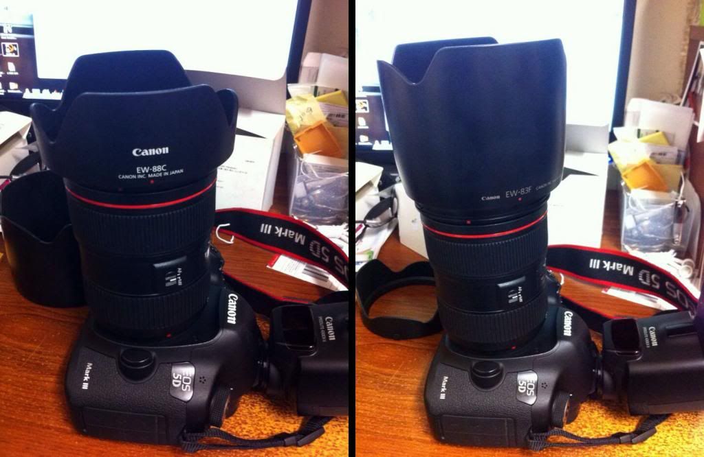 Em thì quan tâm nhất là mặt thẩm mỹ, lens khủng mà nhìn xấu thì em cũng chả thèm. Đã không cầm thì thôi, cầm là phải hoành tráng một xíu. Các bác cứ nhìn cái hình của em các bác sẽ thấy lens hood của 24-70 II L nó tồi tệ thế nào. Bác nào biết cái lens hood nào dài dài có thể lắp vừa vào lens 24-70 II L. Giá cả không thành vấn đề, em chỉ cần các bác cho cái tên của nó. Em tự lên mạng mua. Hoặc bác nào mà chuyên về đồ nhựa, có thể làm được cái lens giống EW-83F mà khớp lắp vừa cho 24-70 II L. Em xin trả bác 2 triệu tiền công. Em mới mua cái lens 24-70 II L. Sau khi lắp cái lens hood EW-88C của nó vào, nhìn tởm mửa không thể tả được. Thành ra em lại chạy đi mua cái lens hood EW-83F giá $73. Cuối cùng lại không lắp được vì nó chỉ có 77mm trong khi 24-70 II L là 82mm.