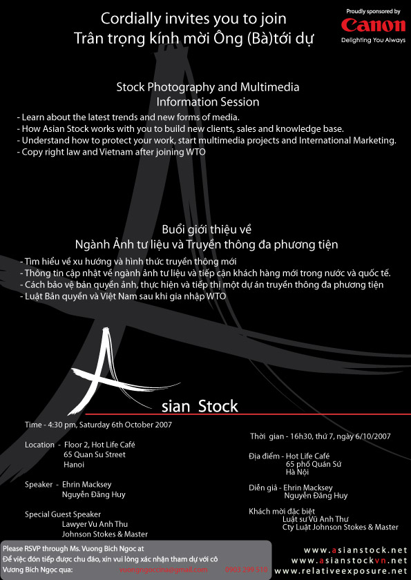 Tiếp sau buổi giới thiệu về ngành ảnh tư liệu và truyền thông đa phương tiện tại TP HCM tháng 7/2007, công ty Asian Stock sẽ tổ chức một buổi giới thiệu tương tự tại Hà Nội vào ngày Thứ Bảy, 6/10/2007