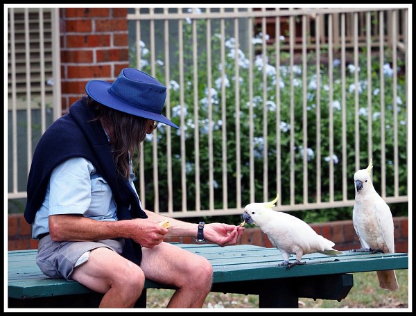| Đây là cảnh thường thấy ở những công viên bên Úc , chim chóc và người rất thân thiện |