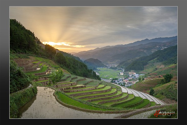| Trên đường sau khi săn ảnh ruộng bậc thang ở Ngã Ba Nhà về lại thị trấn Mù Cang Chải thì bầu trời hoàng hôn chợt vàng rực ...! Tôi thảng thốt với vẻ đẹp bầu trời, nhưng đất lạ - người lạ thì biết chổ nào ruộng bậc thang đẹp mà chạy cho kịp! Tôi nói to cho anh chàng dẫn đường - giáo viên Kiên đam mê chụp ảnh: chổ nào chổ nào....! Kiên phóng xe như bay, vừa chạy vừa nói bác theo em... bác theo em.... Chạy lên nhiều đồi dốc quanh co ... đến chổ này chỉ vừa kịp rút máy ảnh ra bấm liền mà không kịp dùng tripod. Ôi, quê hương ta thật đẹp! |