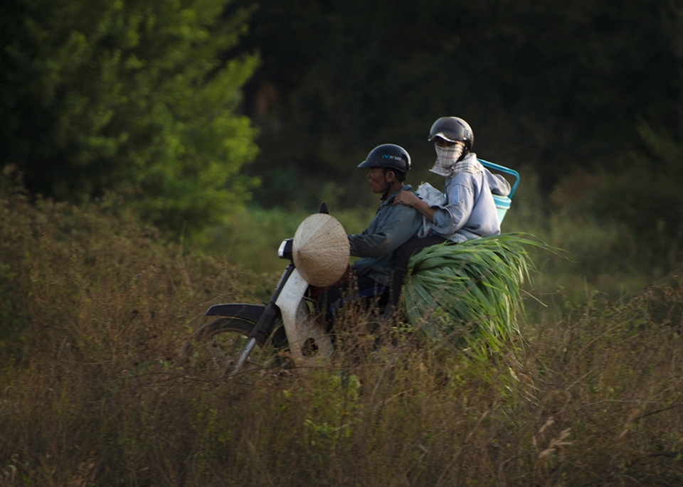 Cuối ngày, em bắt gặp đôi vợ chồng này cùng trên đường từ công trường về lại văn phòng. Chị vợ ngồi trên bó cây bắp mang về cho bò ăn, tay xách nách mang đủ thức phía sau.